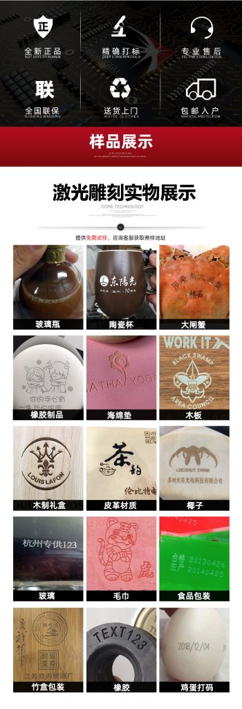 CO2/二氧化碳激光打標機可標刻:多種非金屬材料和部分金屬制品,如竹制品、木材、亞克力、皮革布料、玻璃、建筑陶瓷,紙,PP料等。