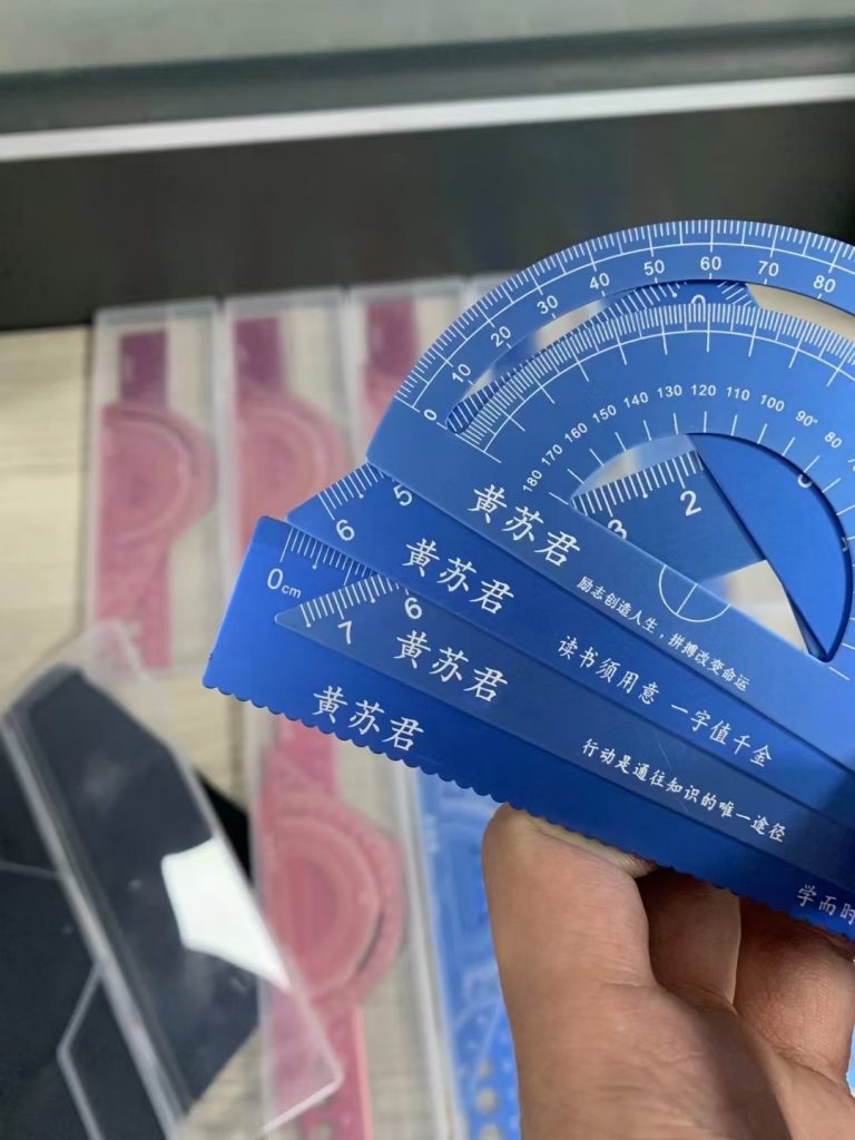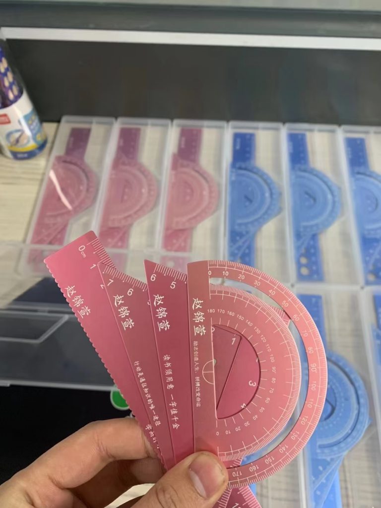 而針對市面常見的文具尺子類型比如亞克力、不銹鋼及鋁合金等材質(zhì)。從中挑選出價(jià)格適宜的材質(zhì)商品,多款比較中鋁合金材質(zhì)文具套尺不論韌性、重量、色彩、環(huán)保等方面更勝一籌,且可以與標(biāo)記樹脂鉛筆的光纖激光打標(biāo)機(jī)實(shí)現(xiàn)一機(jī)多用。(光纖激光打標(biāo)機(jī)除標(biāo)記樹脂鉛筆外還可標(biāo)記軍牌、銘牌、部分硬塑料、不銹鋼尺子和鋁合金套尺)